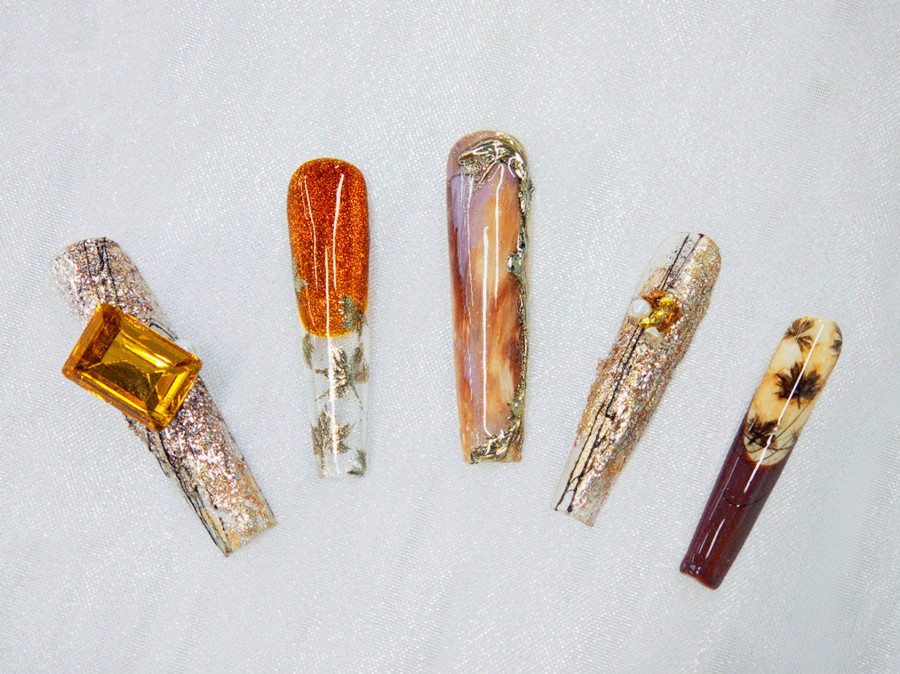 廣西美甲課堂實訓、廣西美甲培訓實操:整副作品主要是以暈染技術(shù)和水晶砂礫共同打造而成。以透明底作為底色,用暈染液打造出的琥珀色的圖案營造出夕陽的氛圍感。再用水晶砂和金箔紙繪制出楓葉,暈染出落日般的晚霞,整體視覺營造出了一種非常低調(diào)、優(yōu)雅、夢幻的精致感。